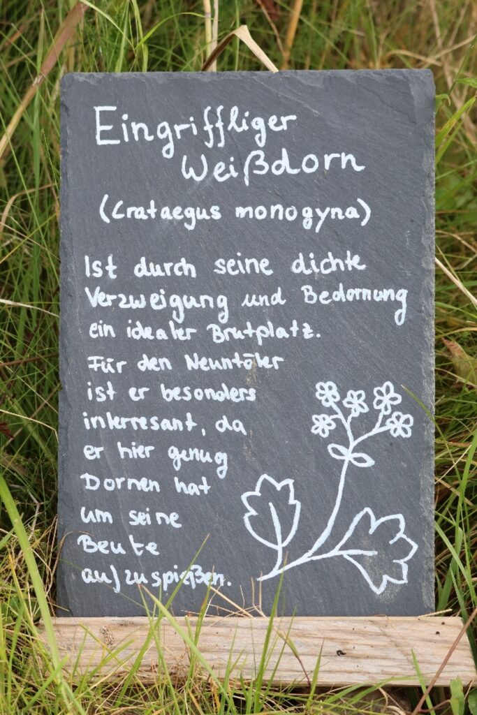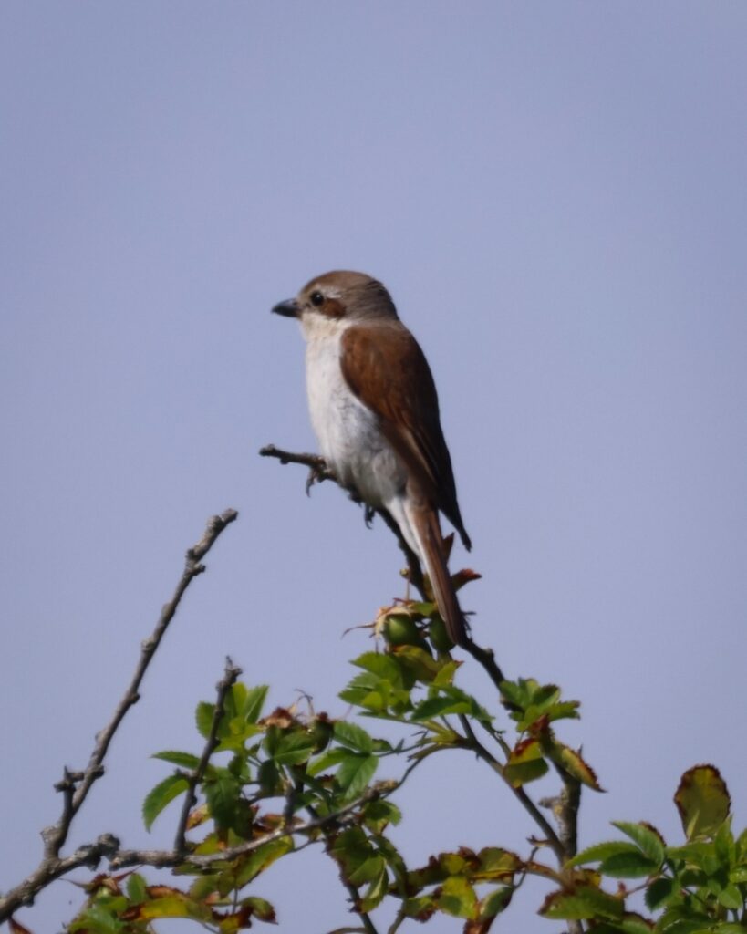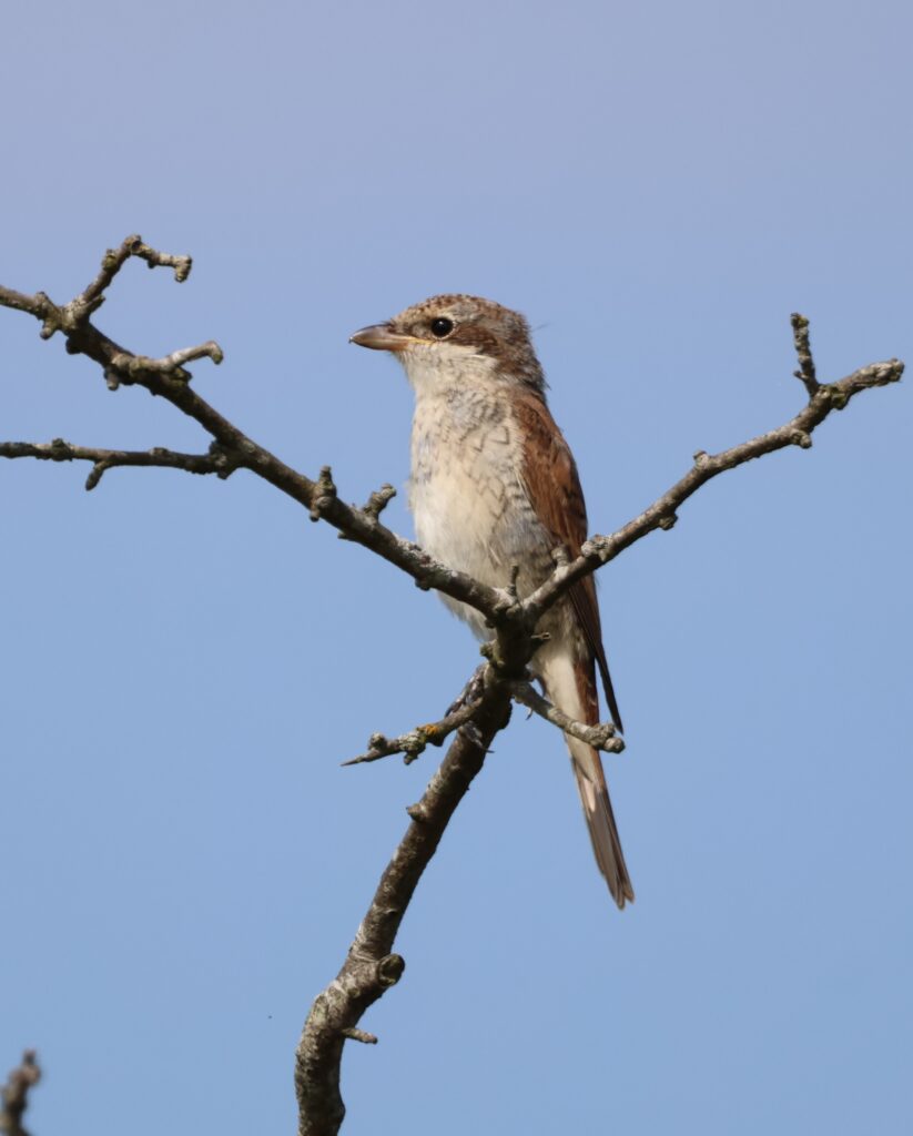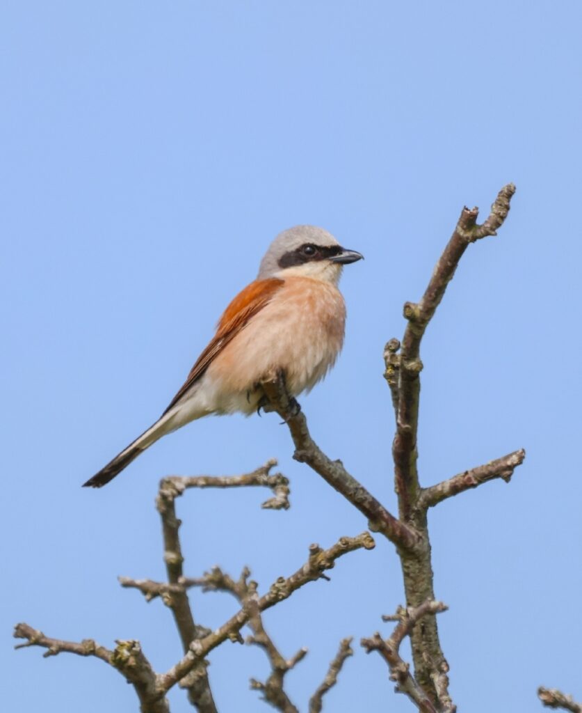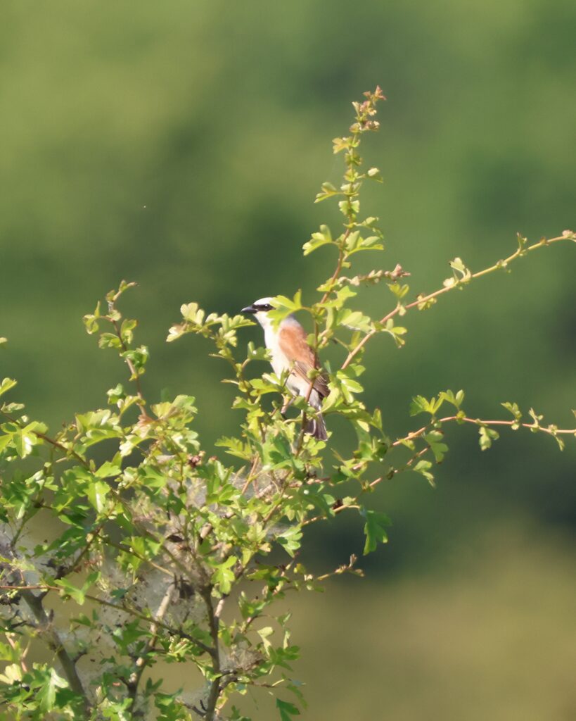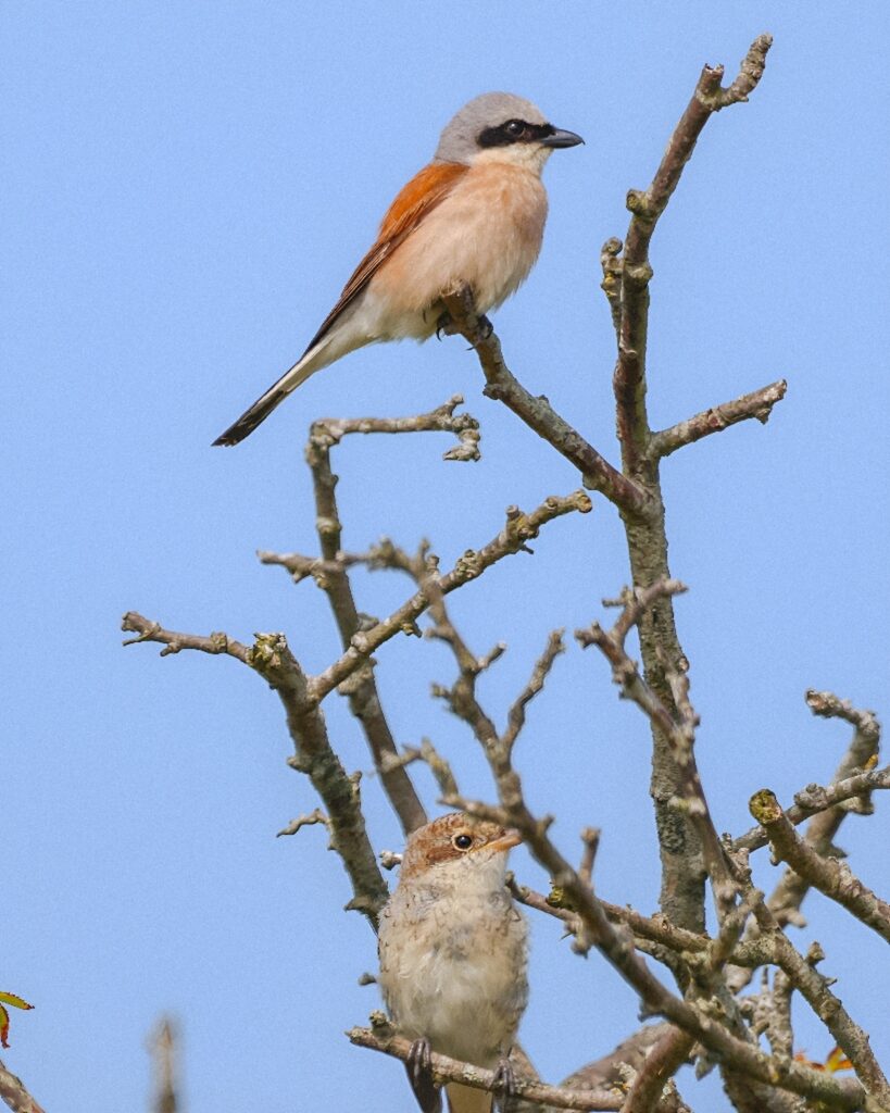 Familie Neuntöter bzw. Rotrückenwürger. Wer zum Teufel kommt auf solche Namen? Das war mein erster Gedanke. Mittlerweile finde ich sie alles andere als unpassend, ist er doch schon so ein kleiner fieser Vogel. Der Neuntöter, das Männchen trägt so eine Art Augenbinde à la Panzerknacker, spießt seine Beute nämlich auf Dornen oder auch Stacheldraht auf und nutzt diese Form als Speisekammer. So kann man es natürlich auch machen.